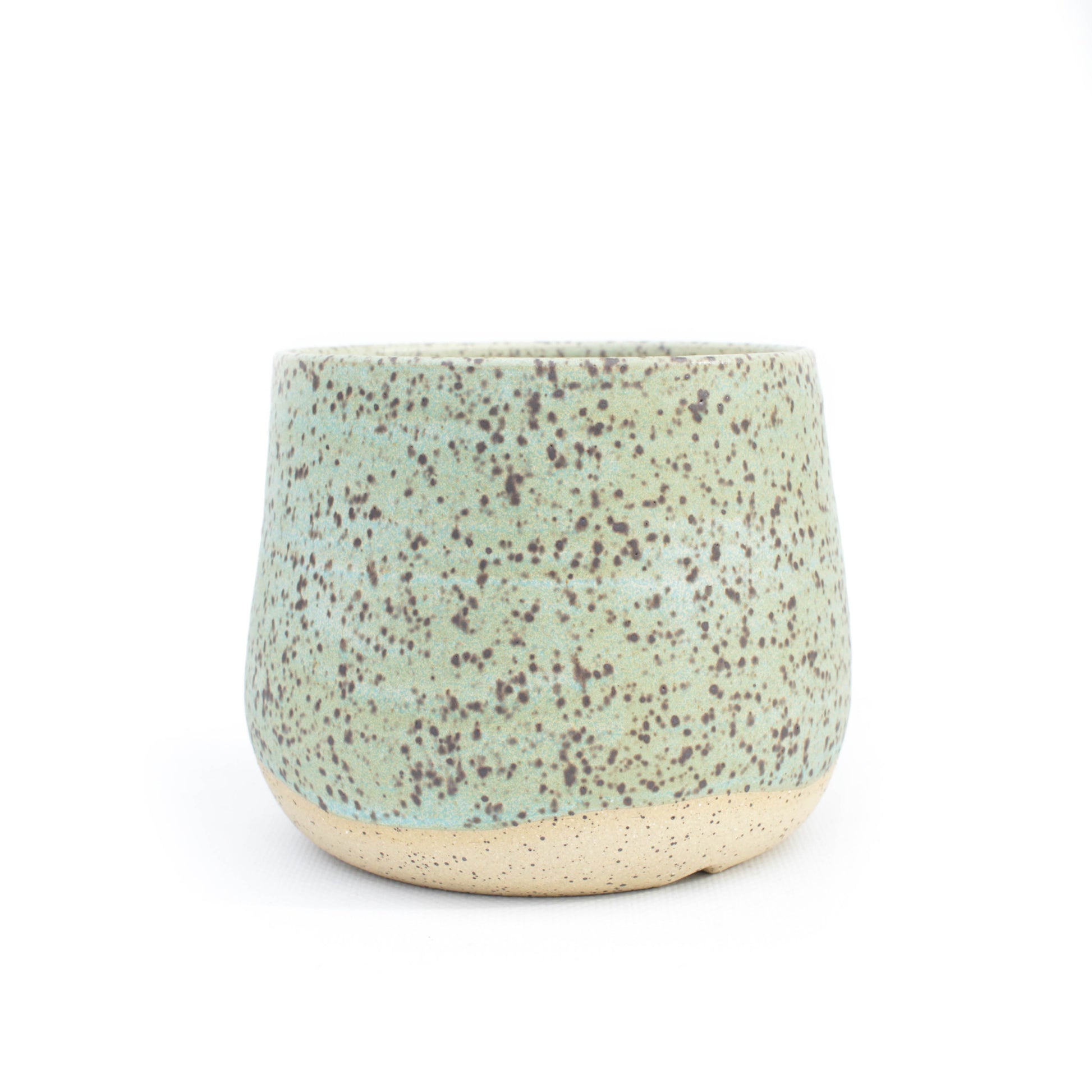 Matte mint seafoam green speckled stoneware wheel thrown planter pot with drainage hole. Perfect for houseplants, succulents or cactus. Small batch artisan studio ceramics handmade in Texas. A perfect housewarming, Christmas, holiday, birthday or just because gift for plant lovers.