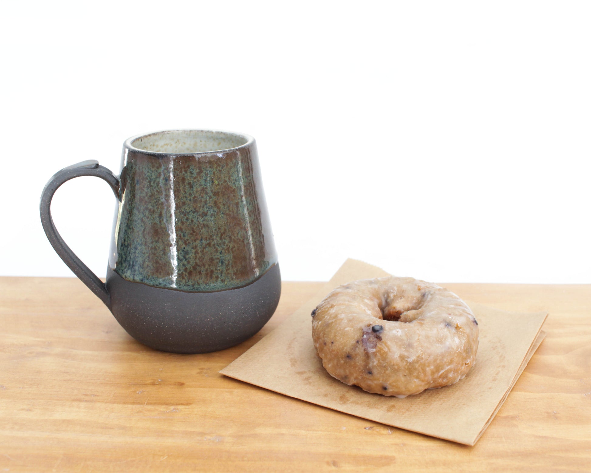 Blue brown glazed black stoneware wheel thrown one-off ceramic mug. Comfortable mug with generous portions for getting the best start to your daily routine. Unique pottery gifts for husband or wife anniversary, holiday or just because. A handmade mug for coffee, tea or your favorite beverage handcrafted with love in my small batch Texas home studio.
