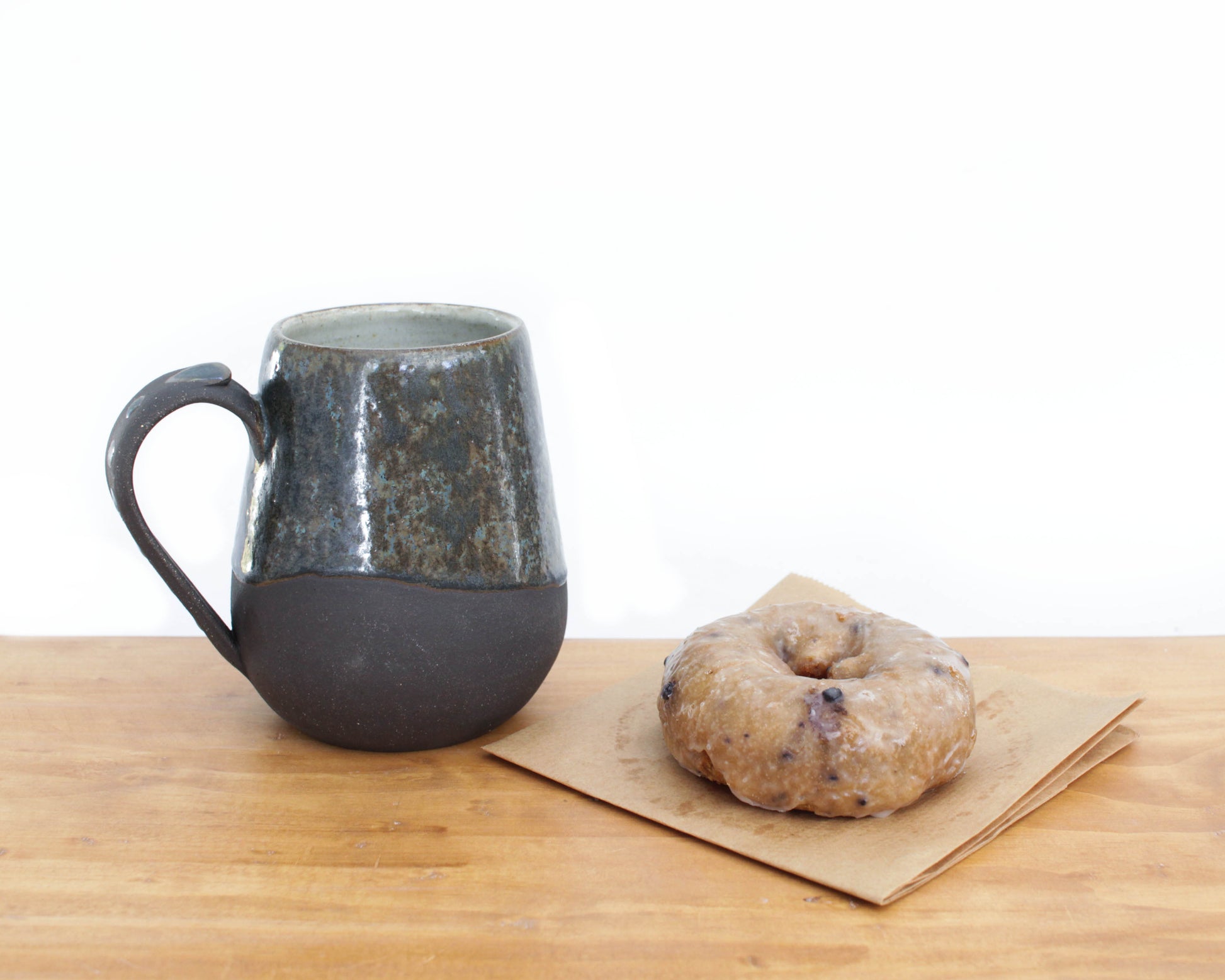 Blue crystalline glazed black stoneware wheel thrown one-off ceramic mug. Comfortable mug with generous portions for getting the best start to your daily routine. Unique pottery gifts for husband or wife anniversary, holiday or just because. A handmade mug for coffee, tea or your favorite beverage handcrafted with love in my small batch Texas home studio.