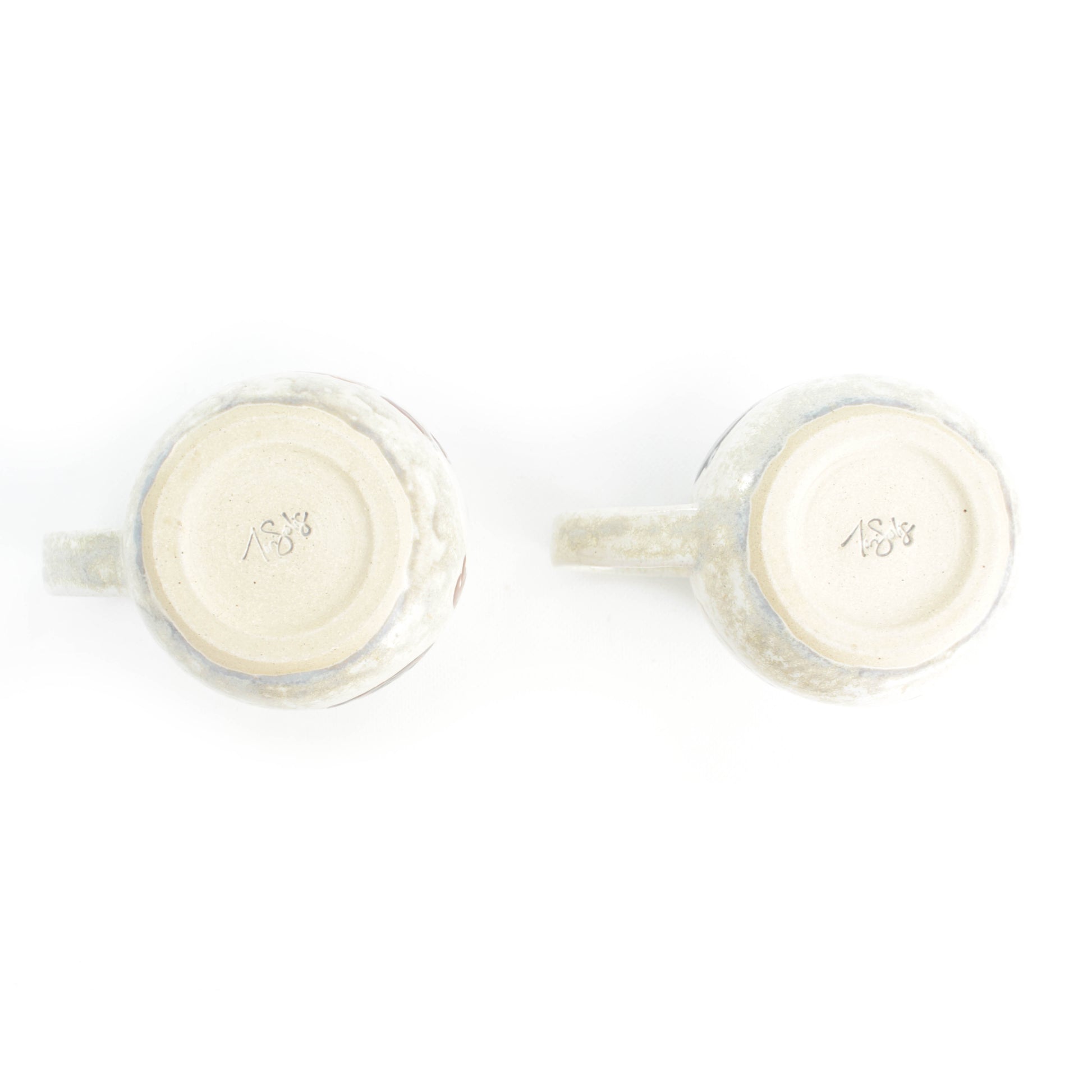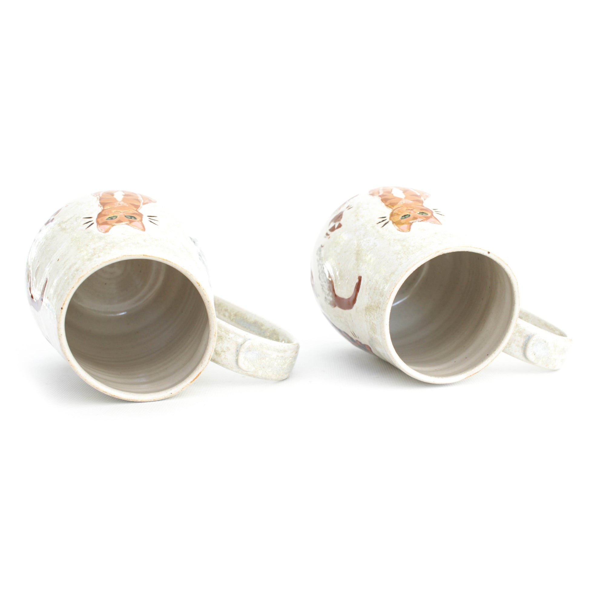 Hand painted creamy white crystal glazed cat mug. Wheel thrown stoneware ceramic pottery. A great mug for tea, coffee, or your favorite beverage. Comfortable mug with generous portions for getting the best start to your daily routine. Unique pottery gifts for husband or wife anniversary, holiday or just because. A handmade mug for coffee, tea or your favorite beverage handcrafted with love in my small batch Texas home studio.