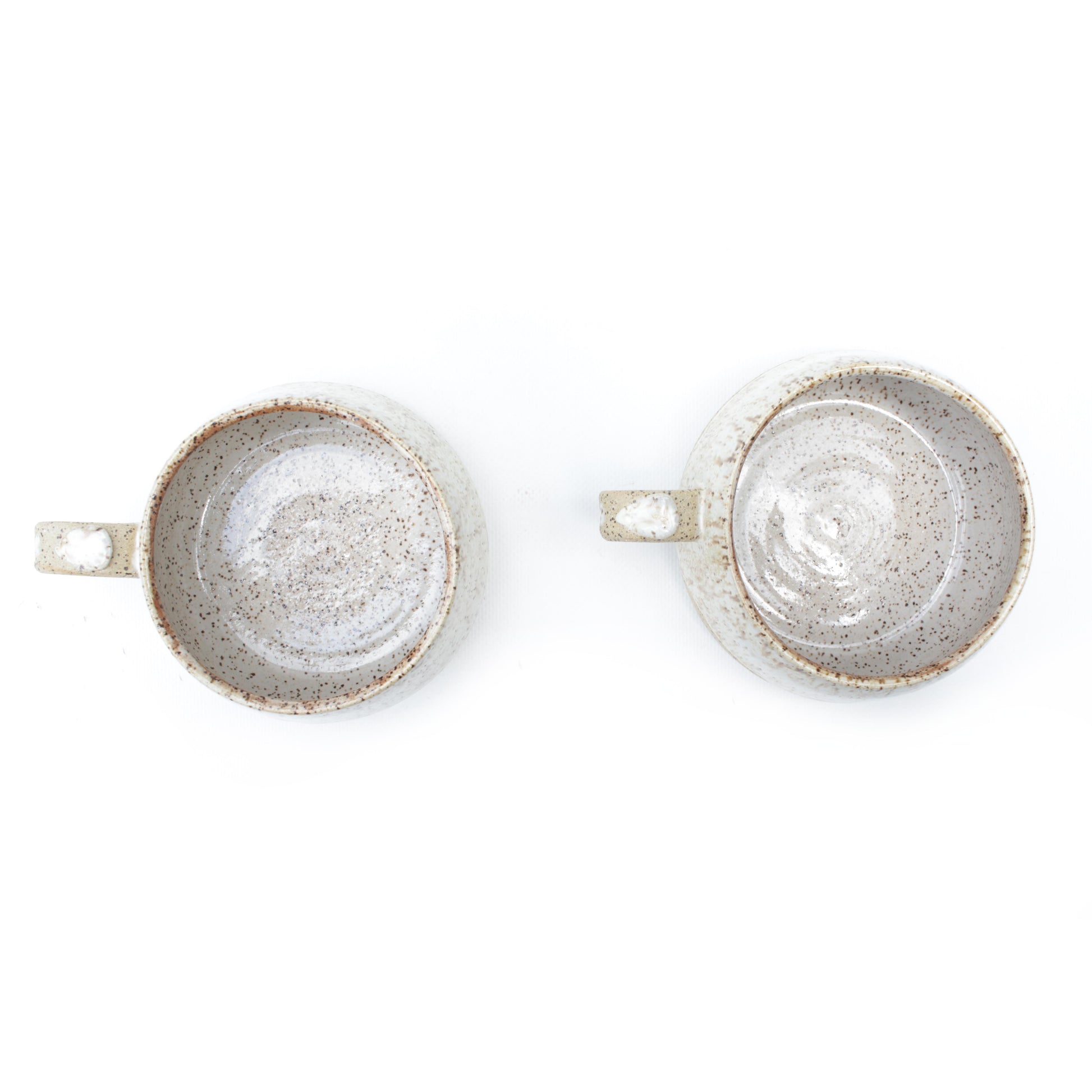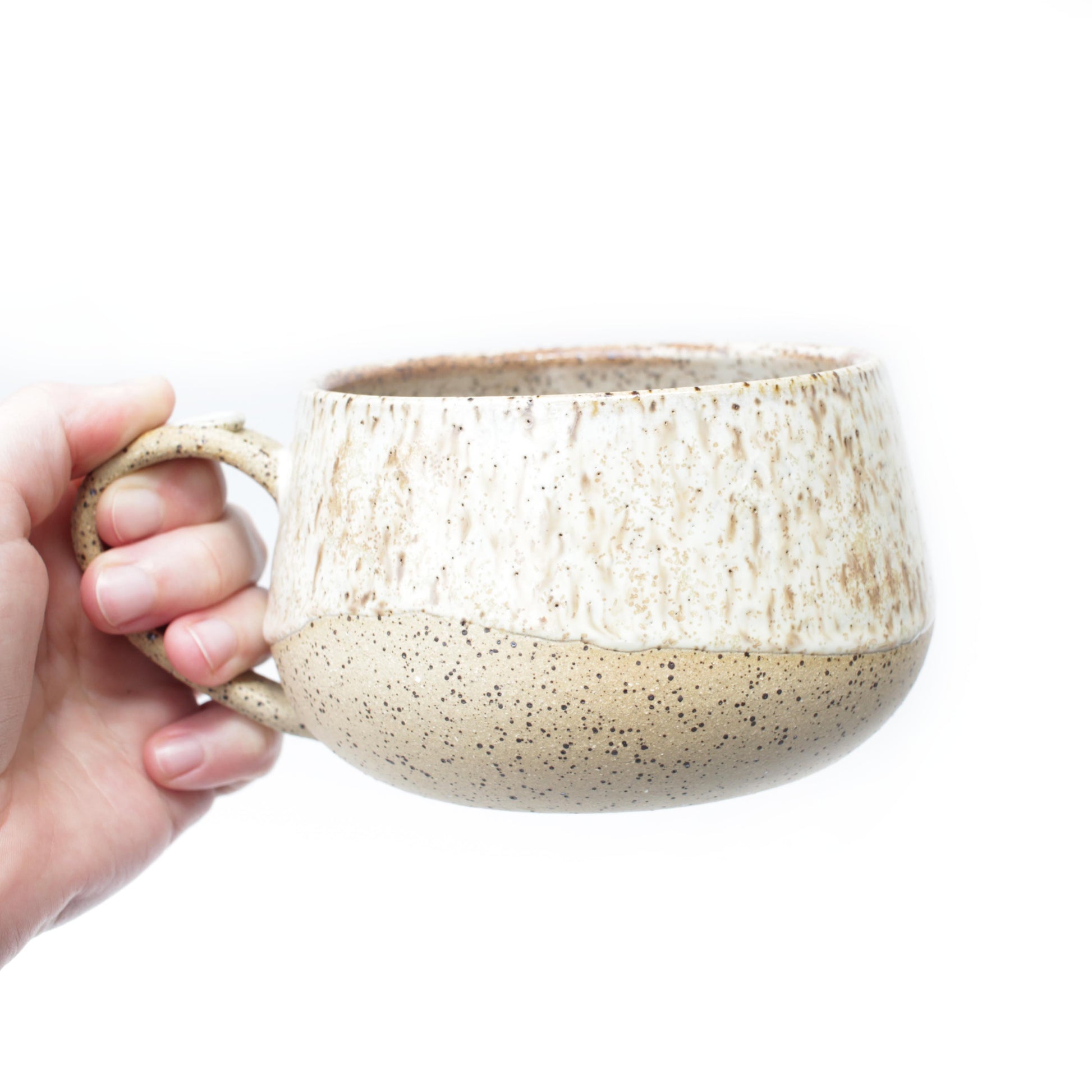 Crystal cream glazed speckled beige wheel thrown latte mug. Handmade and hand painted glaze. Small batch, one-off studio pottery made in Texas. Shallow round design perfect for coffee, tea or your favorite beverage. Comfortable mug with generous portions for getting the best start to your daily routine. Unique pottery gifts for husband or wife anniversary, holiday or just because. A handmade mug for coffee, tea or your favorite beverage handcrafted in Texas.