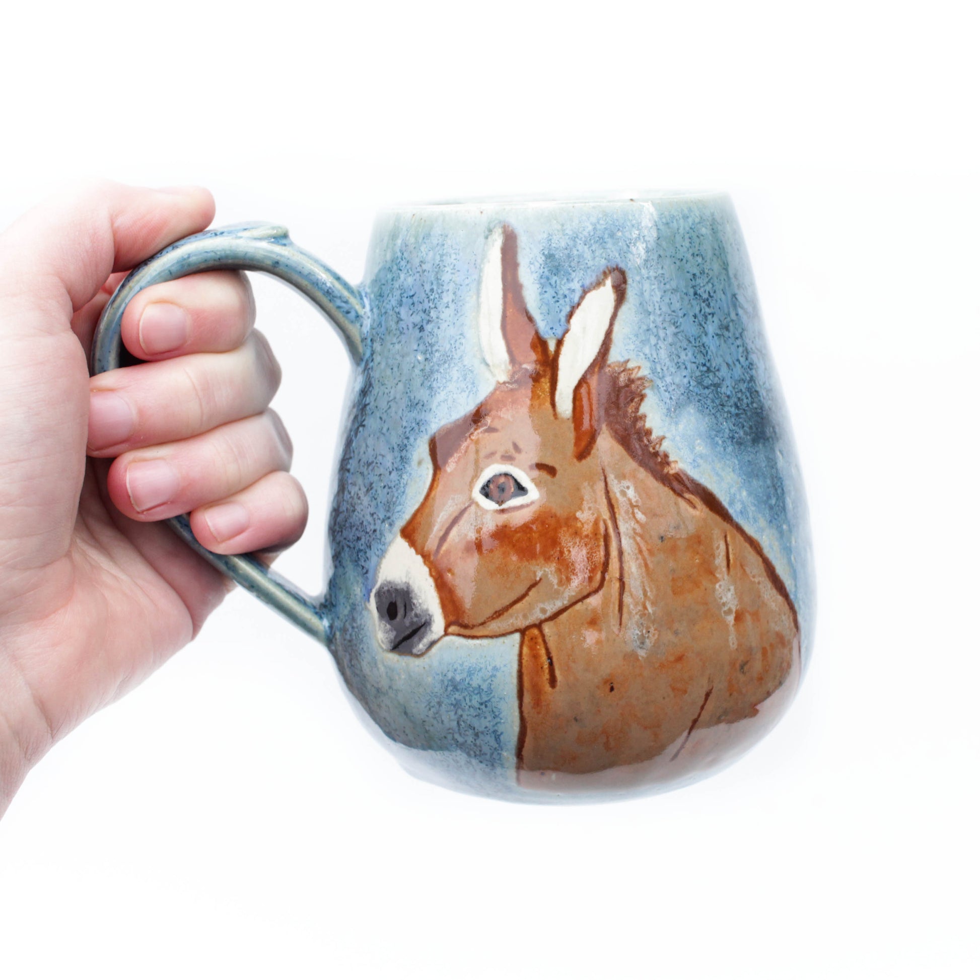 Hand painted brown donkey blue glazed mug. Wheel thrown stoneware ceramic pottery. A great mug for tea, coffee, or your favorite beverage. Comfortable mug with generous portions for getting the best start to your daily routine. Unique pottery gifts for homesteaders, donkey lovers, husband or wife anniversary, Christmas, birthday, holiday or just because. A handmade mug for coffee, tea or your favorite beverage handcrafted with love in my small batch Texas home studio.