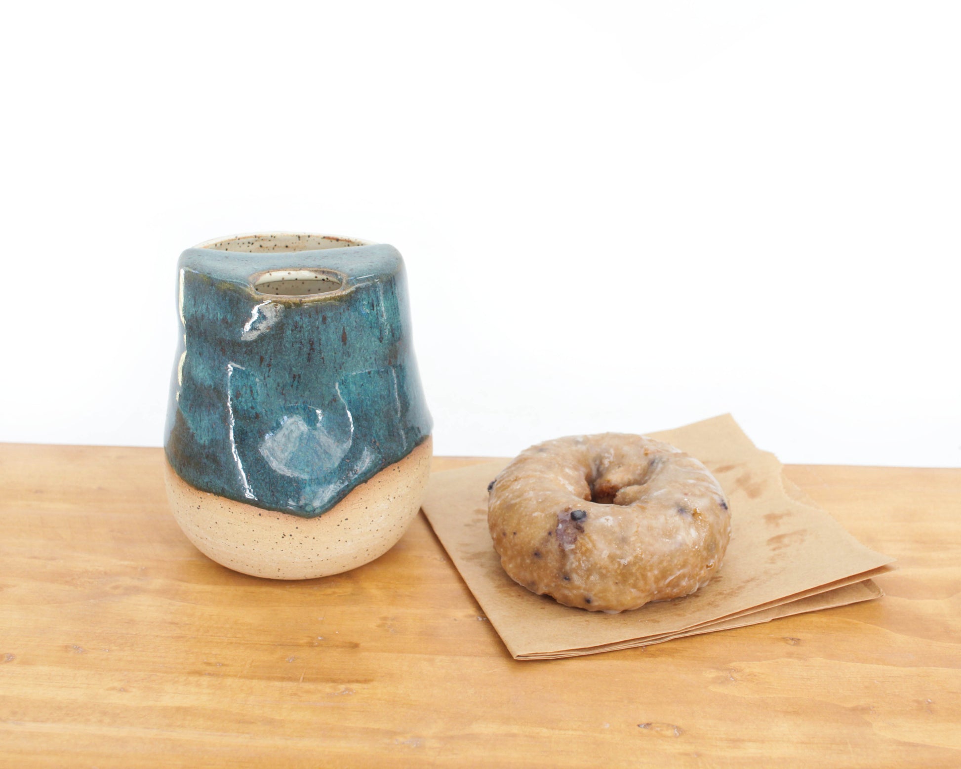 Emerald ocean speckled stoneware wheel thrown cozy thumb tumbler with sip top. A comfortable cozy everyday gift for bookish friends who love to spend a relaxing day inside. The partially covered top works great for keeping your cat out of your favorite drink while you read. Small-batch artisan studio pottery gifts handmade in Texas.
