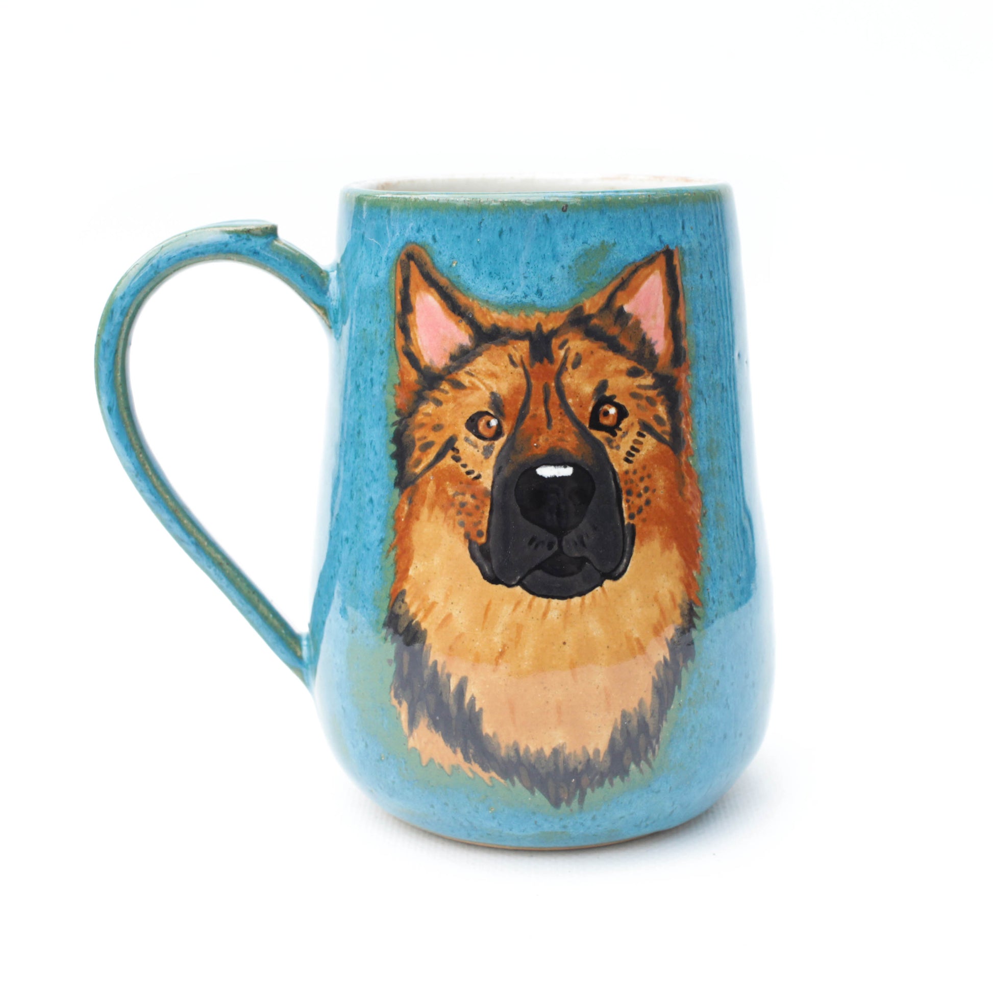 Hand painted German shepherd turquoise glazed mug. Wheel thrown stoneware ceramic pottery. A great mug for tea, coffee, or your favorite beverage. Comfortable mug with generous portions for getting the best start to your daily routine. Unique pottery gifts for dog lovers, German shepherd parents, husband or wife anniversary, Christmas, birthday, holiday or just because. A handmade mug for coffee, tea or your favorite beverage handcrafted with love in my small batch Texas home studio.