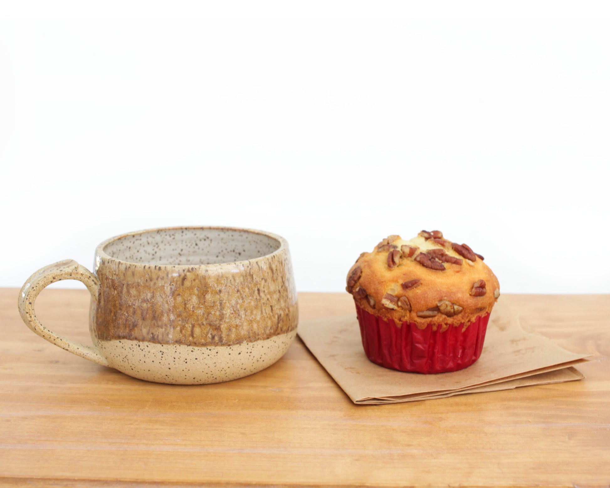 Golden brown crystalline glazed speckled beige wheel thrown wide shallow latte mug. Handmade and hand painted glaze. Small batch, one-off studio pottery made in Texas. Round design perfect for coffee, tea or your favorite beverage. Comfortable mug with generous portions for getting the best start to your daily routine. Unique pottery gifts for husband or wife anniversary, holiday or just because. A handmade mug for coffee, tea or your favorite beverage handcrafted with love in Texas.