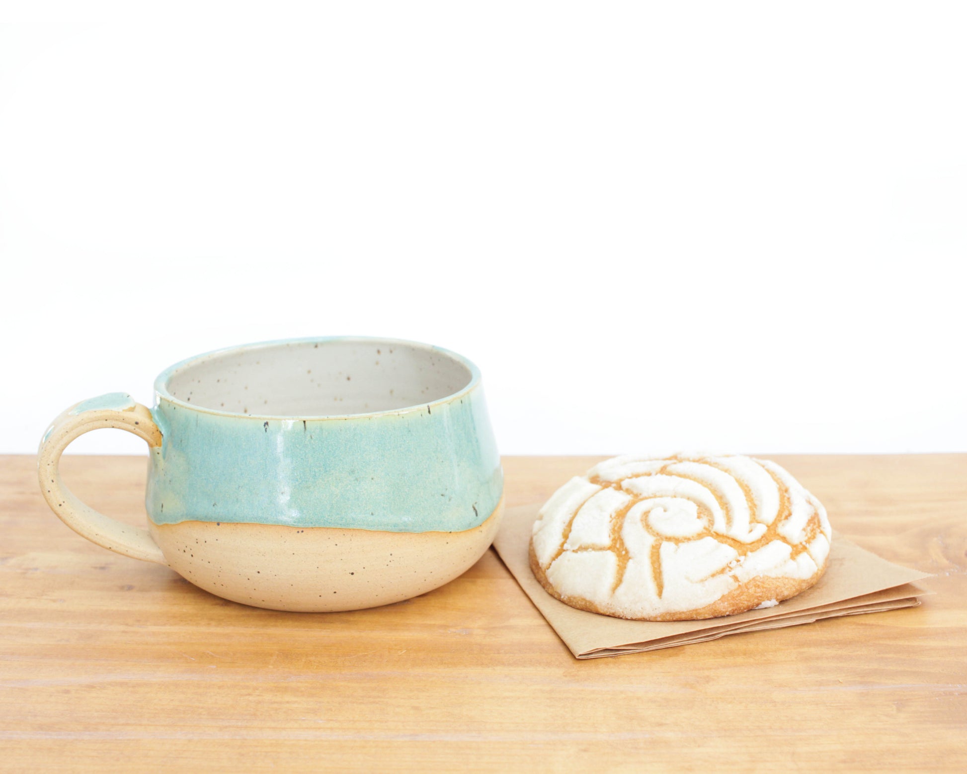 Minty blue green glazed wheel thrown one-off ceramic mug/bowl with handle. Comfortable mug with large, generous portions perfect for curling up with a book and the cat on a rainy day. Unique ready to ship pottery gifts for coffee lovers, friends birthday, anniversary, holiday or just because. A handmade mug for coffee, tea or your favorite beverage handcrafted with love in my small batch Texas home studio. Also great for soup, cereal, ice cream, chili or snacks.