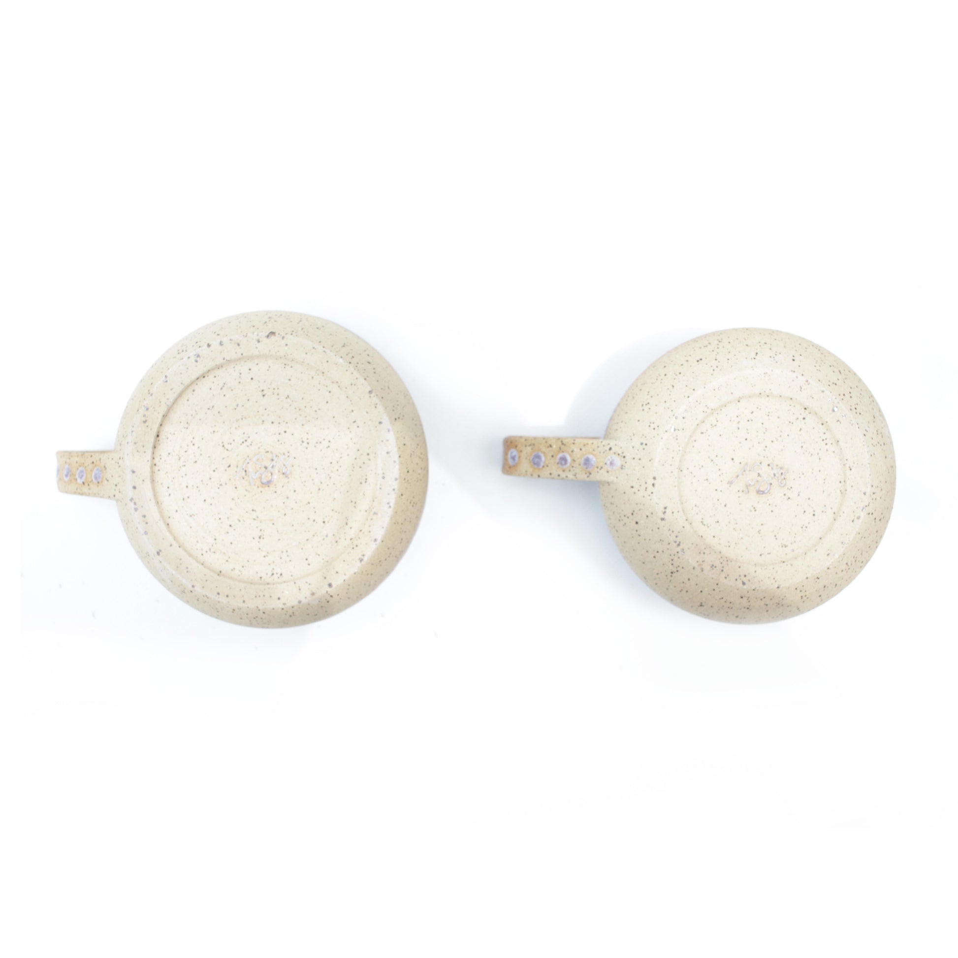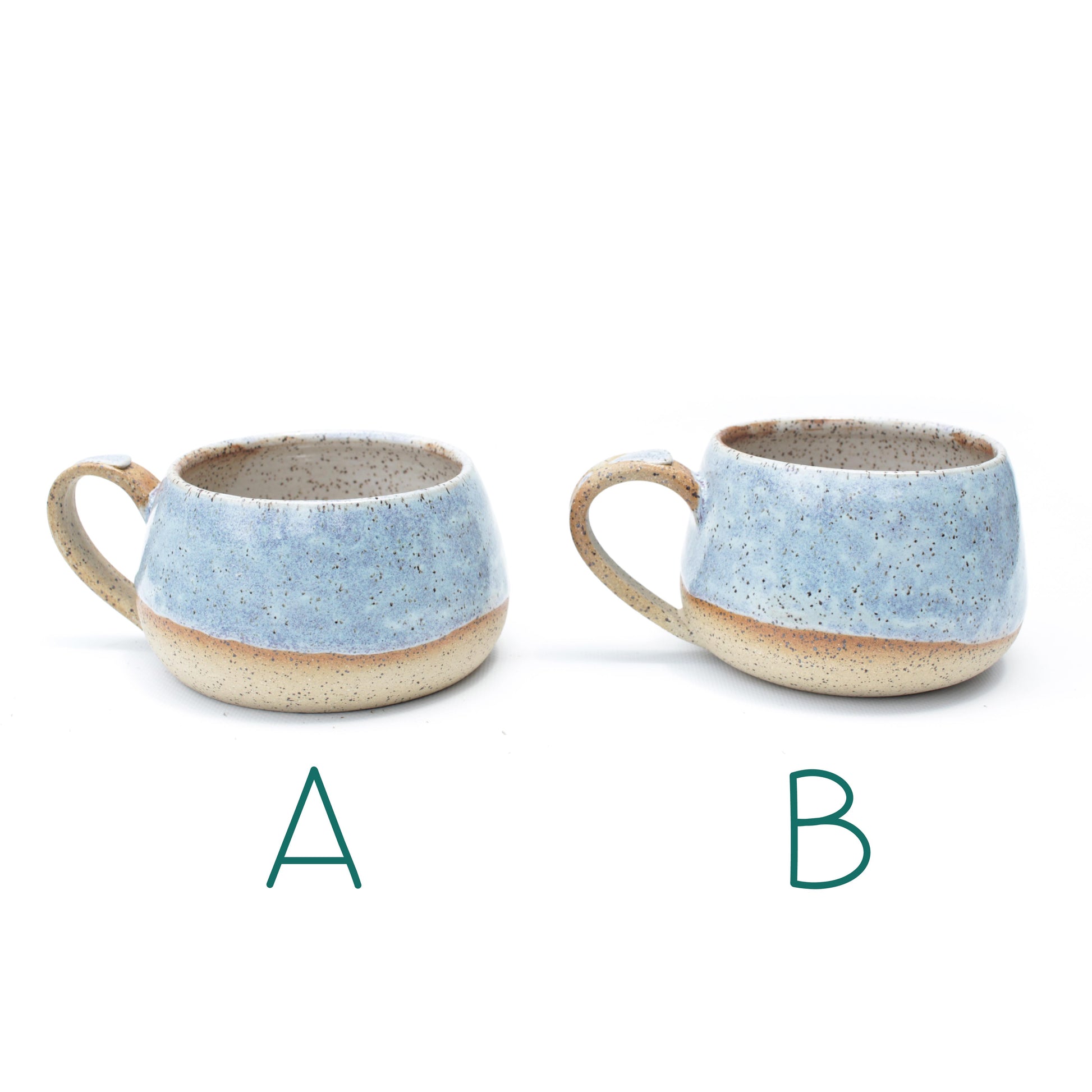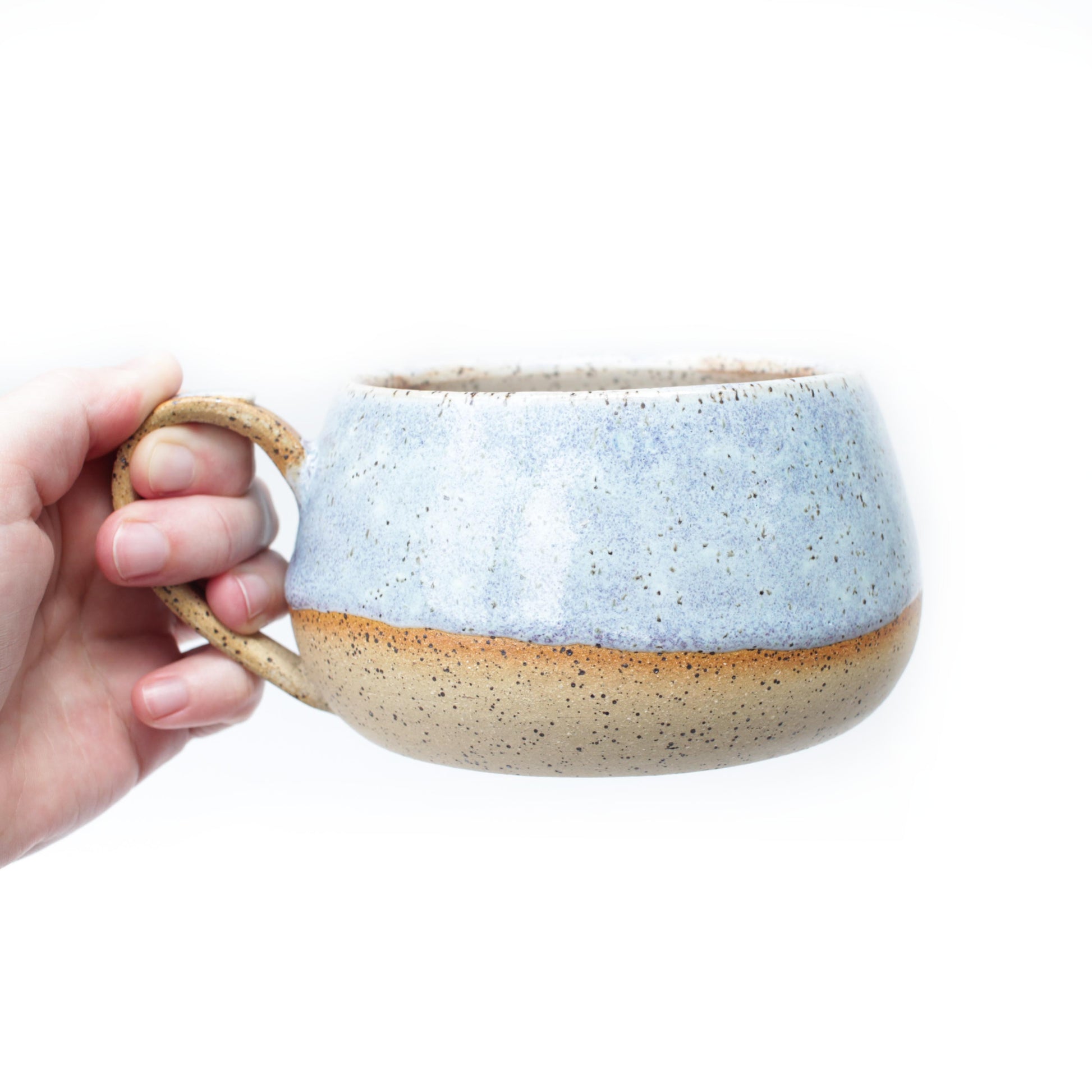 Periwinkle glazed speckled beige wheel thrown latte mug. Handmade and hand painted glaze. Small batch, one-off studio pottery made in Texas. Shallow round design perfect for coffee, tea or your favorite beverage. Comfortable mug with generous portions for getting the best start to your daily routine. Unique pottery gifts for husband or wife anniversary, holiday or just because. A handmade mug for coffee, tea or your favorite beverage handcrafted in Texas.