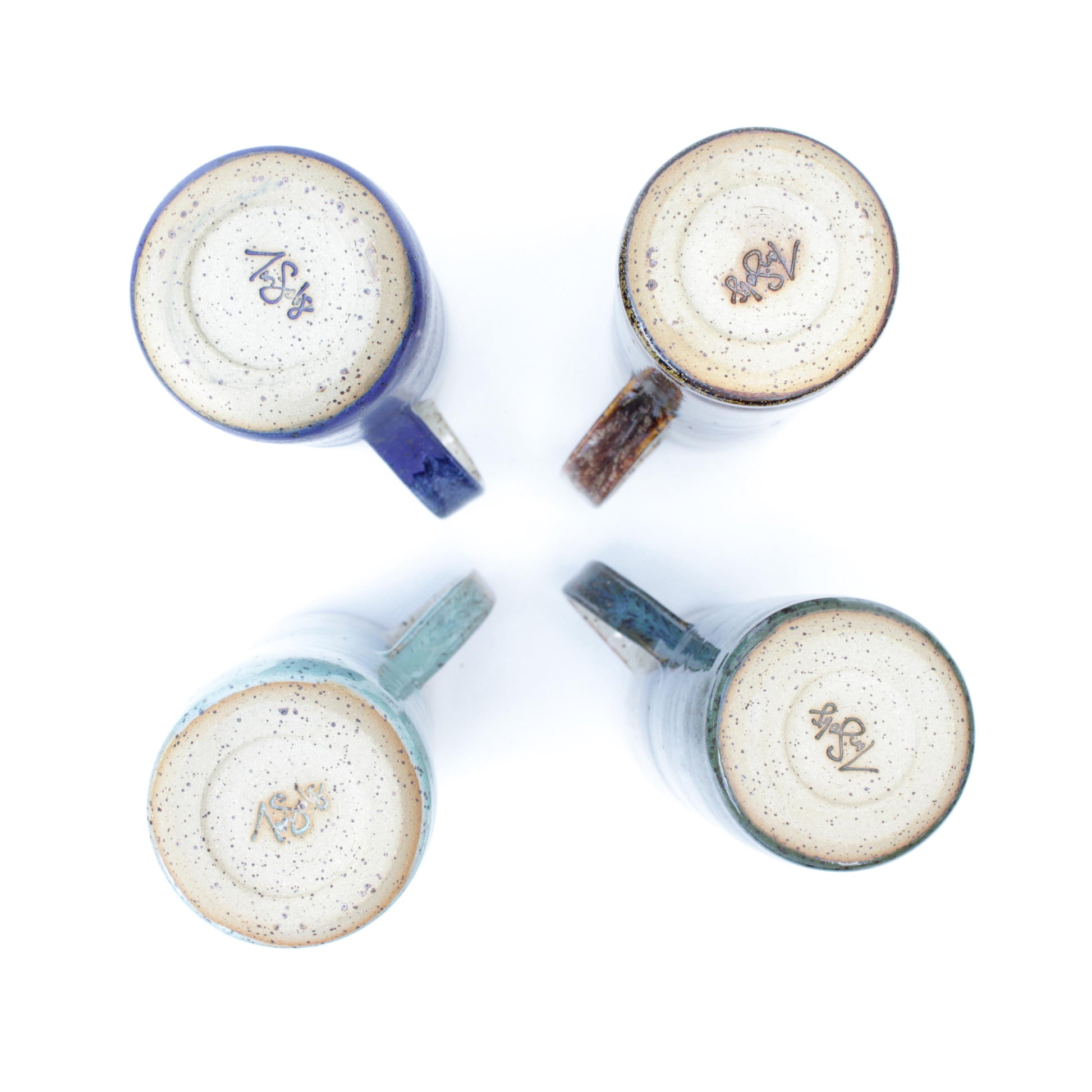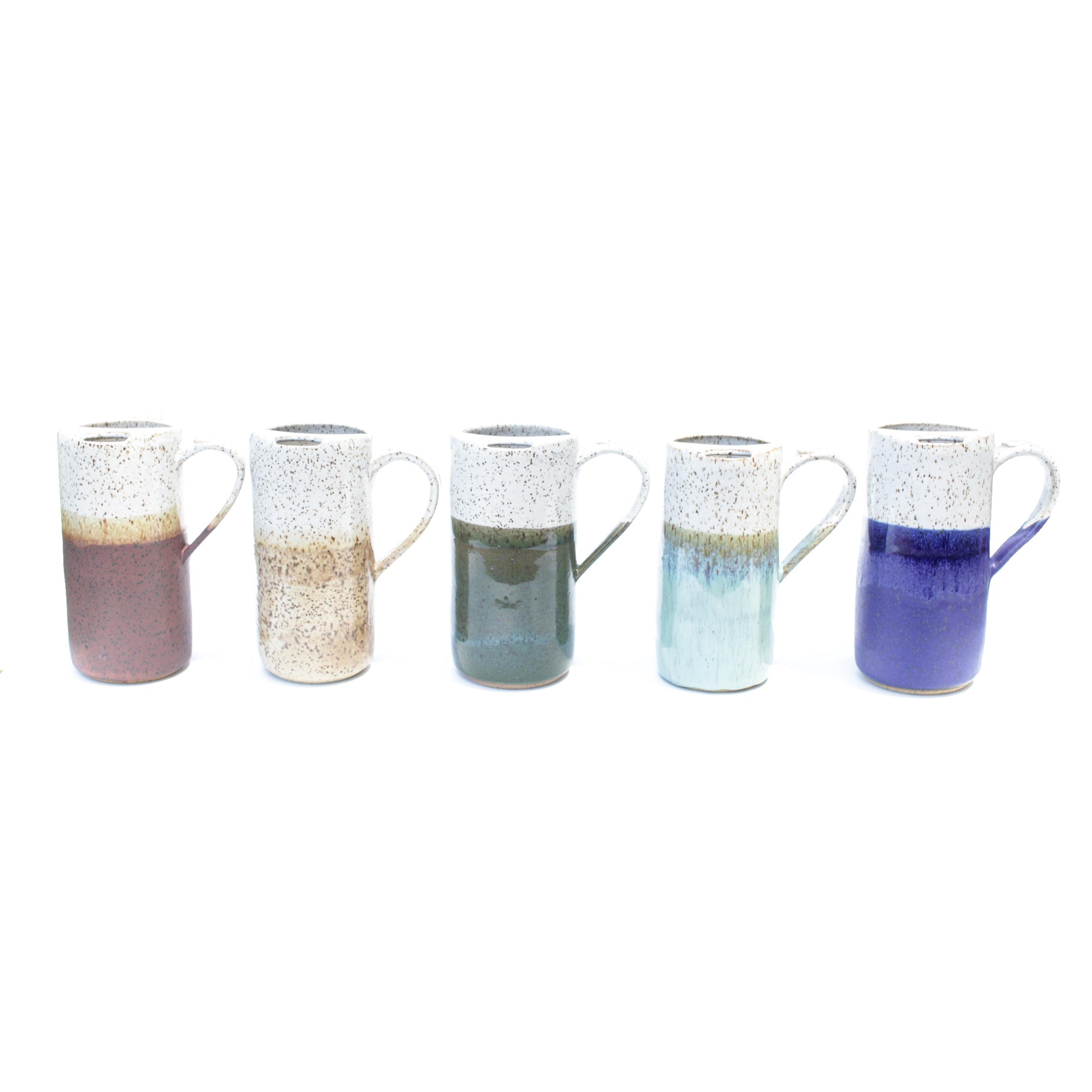 SKINNY: Approximately 2-2.5" at base, 5-6" tall. This version will fit into *most* standard cup holders. 14-16oz. Made with love and plastic free, this handcrafted ceramic travel mug is a sustainable alternative to disposable cups. Size, shape and glaze patterns vary slightly from piece to piece. Left handed mugs available as made-to-order by request.